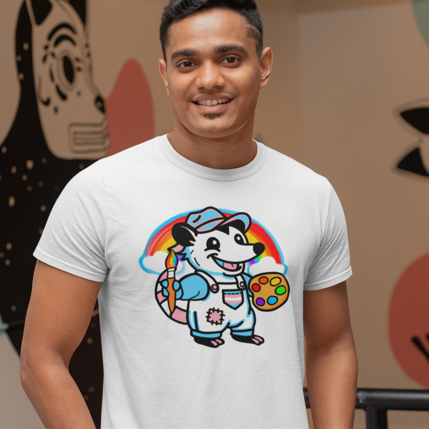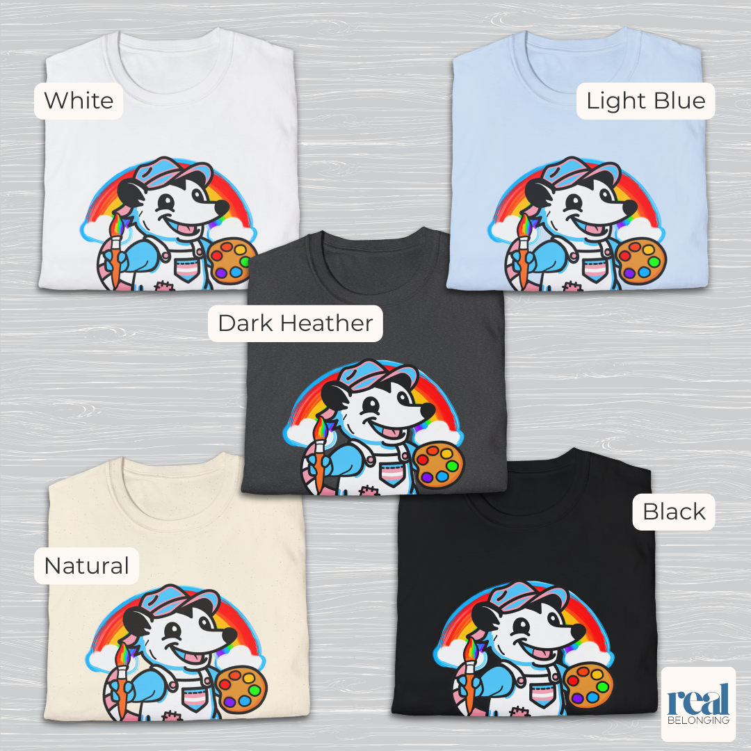 Bring a splash of joy, pride, and whimsy to your wardrobe with our Adorable AF Trans Possum Rainbow Painter tee. Inspired by the soothing vibes of Bob Ross, this shirt celebrates creativity with subtle trans visibility in a playful, eye‑catching design
