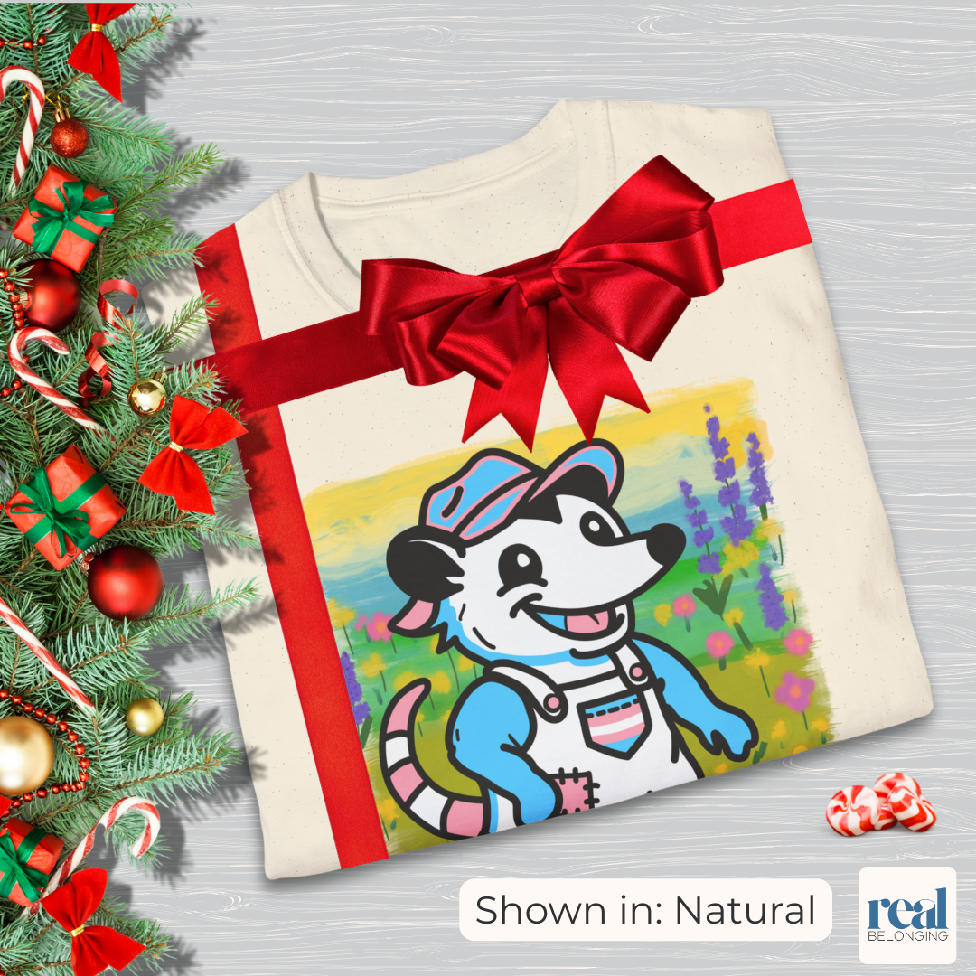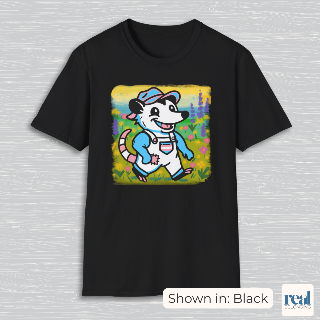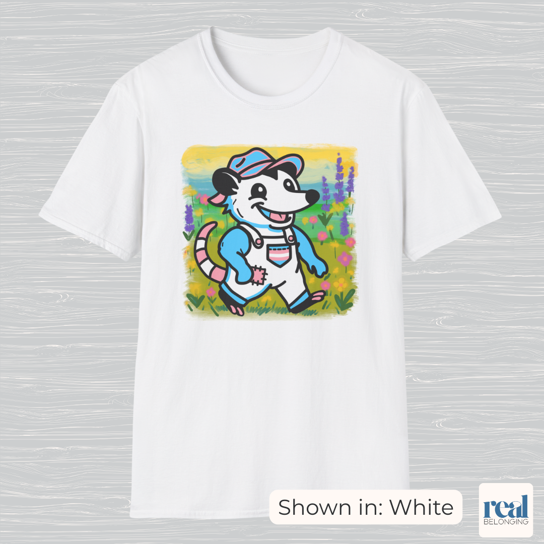 You belong among the wildflowers, where you feel free. Embrace your inner possum and go for a stroll in this hand-drawn, rural trans artist-designed, 100% ring-spun cotton t-shirt. It's soft, serene, and adorable AF — it's everything you need.