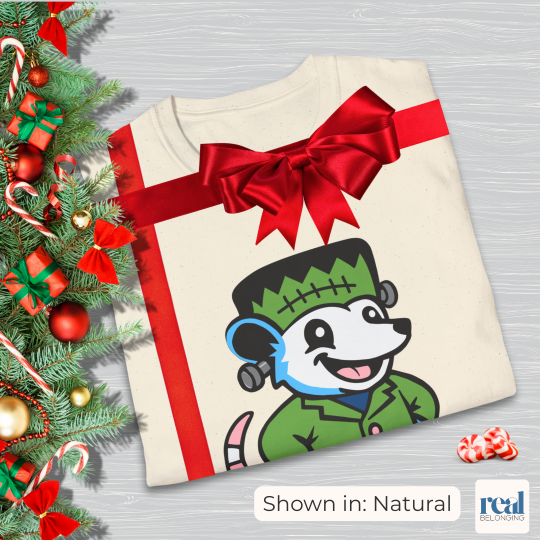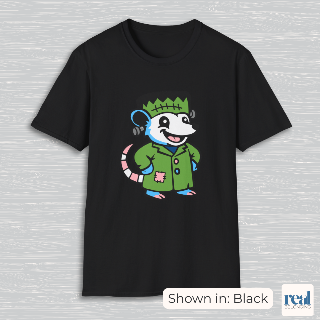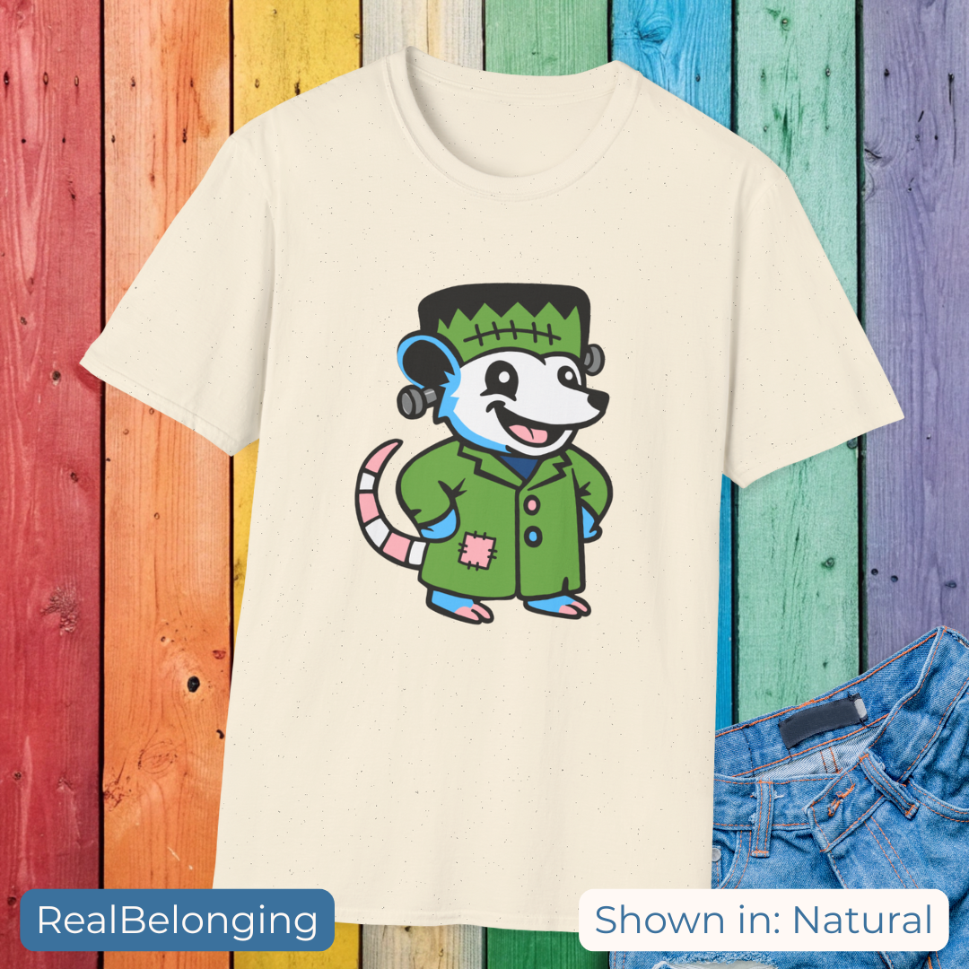 This adorable tee features a hand-drawn Frankenstein possum in soft transgender pride colors. Designed by a rural trans artist, this cozy, spooky-cute shirt supports mutual aid for trans people in the U.S. South. Part of our Adorable AF Halloween collection — perfect for trans folks, allies, or anyone who loves possums with attitude.