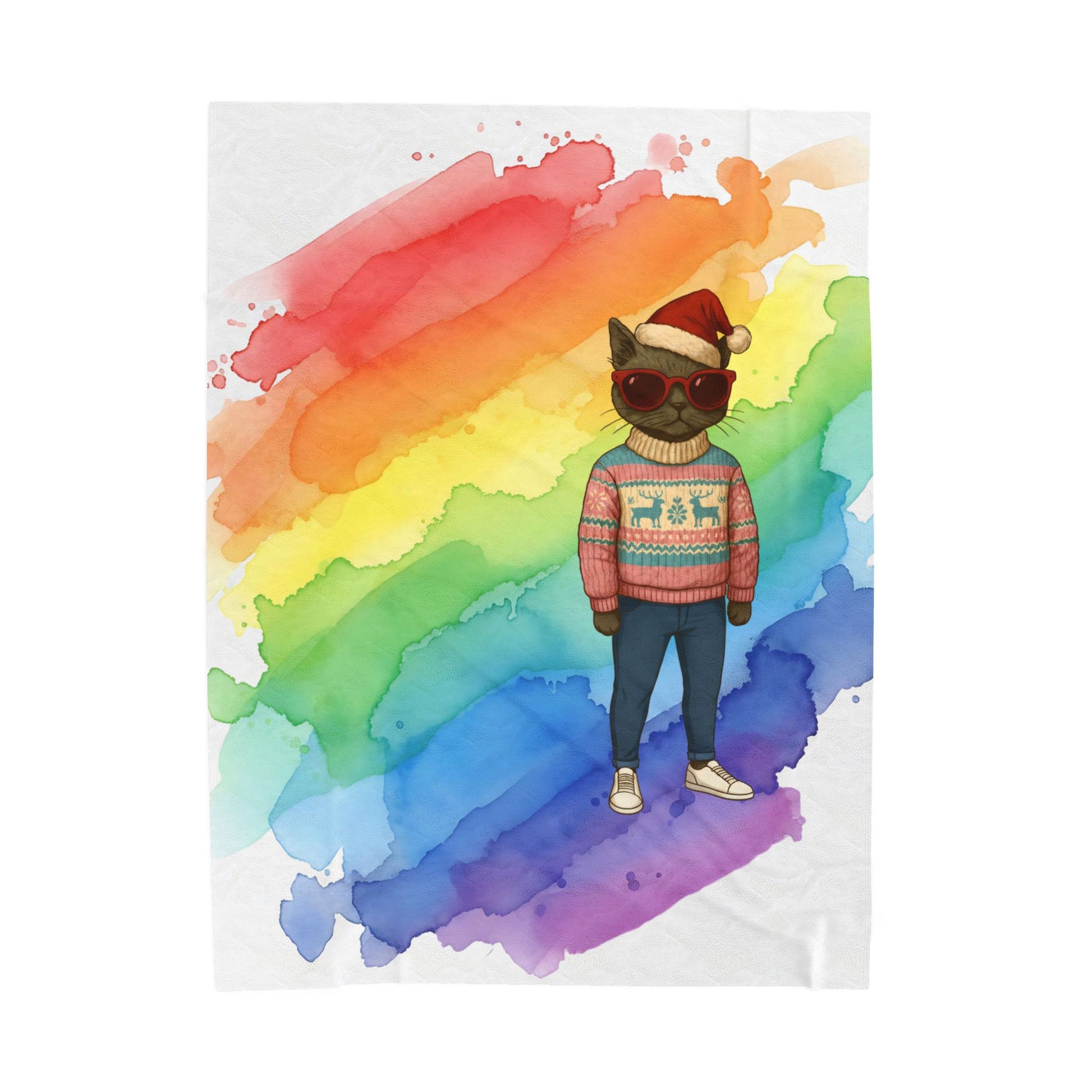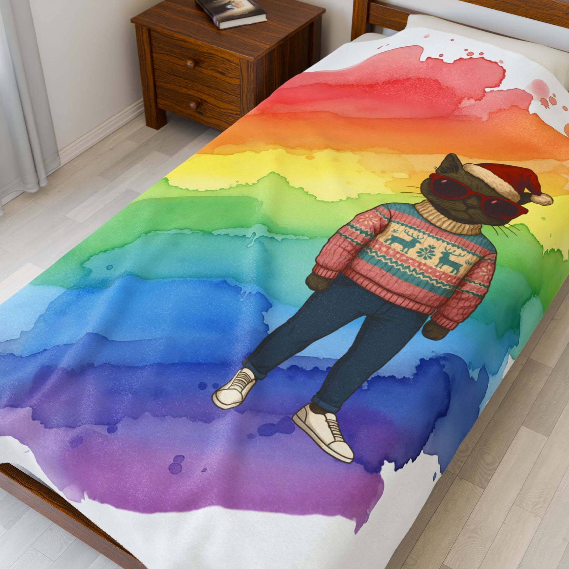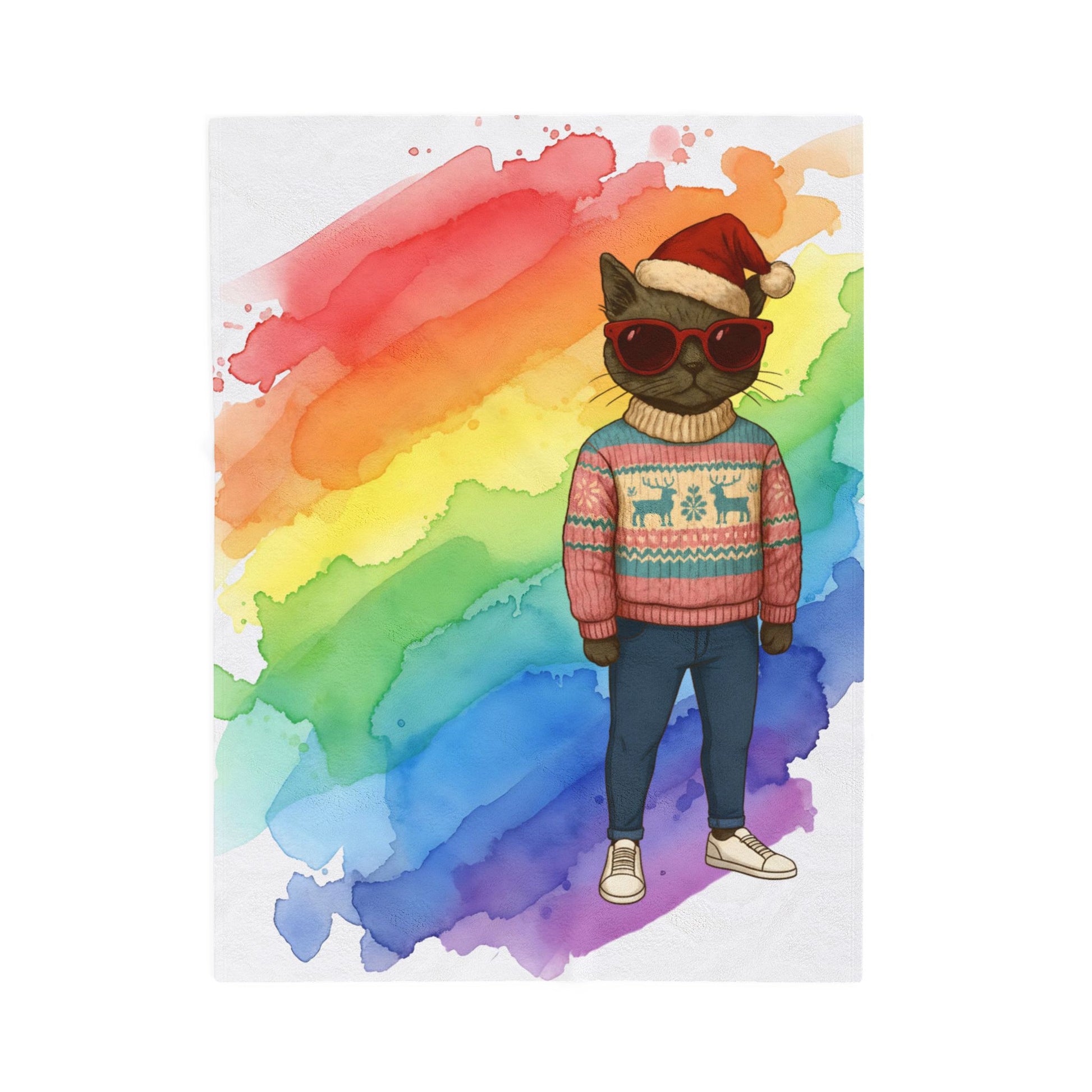 Wrap yourself in winter warmth with this cool cat. Rocking a transgender-pride winter sweater and a festive Santa hat, this cozy friend leaves space on the vibrant watercolor rainbow splash on your side of the bed. The artwork is printed in vivid, high-detail color on one side of a medium-heavy, extra-soft fabric. The plush surface drapes easily over your shoulders or across a couch, wrapping you in comfort and color. Perfect for slow winter evenings, cozy movie nights, and moments where a little pride and a lot of loving warmth make the season feel just right.