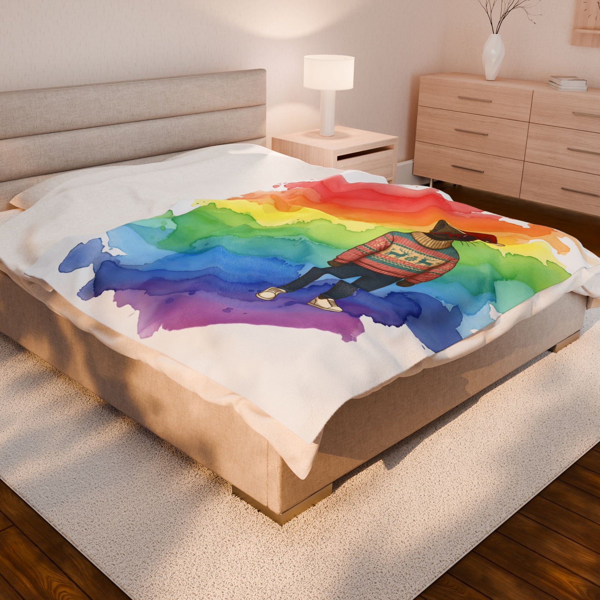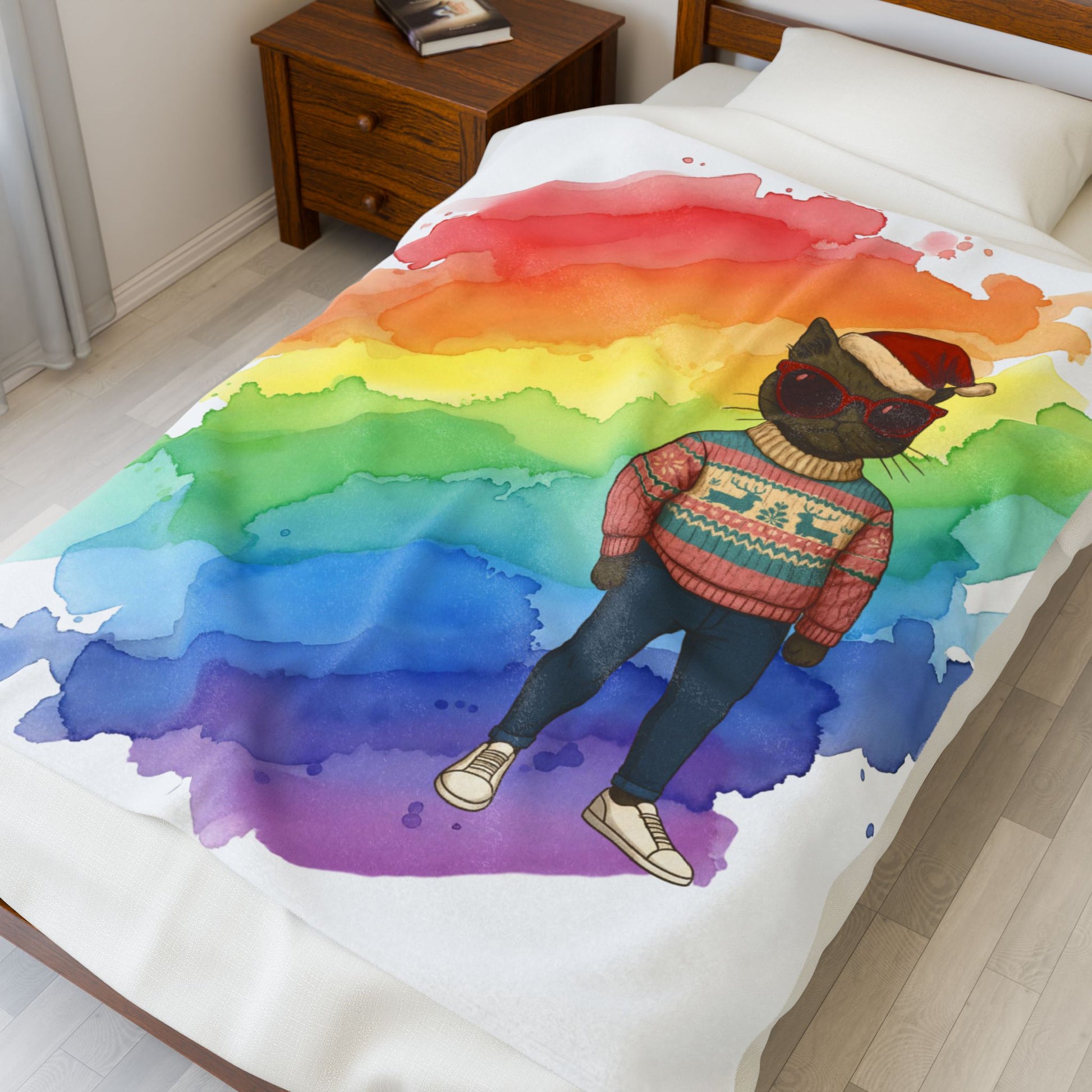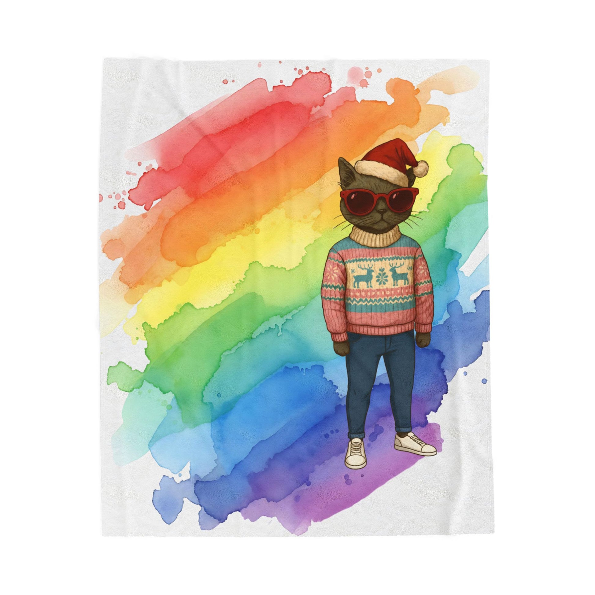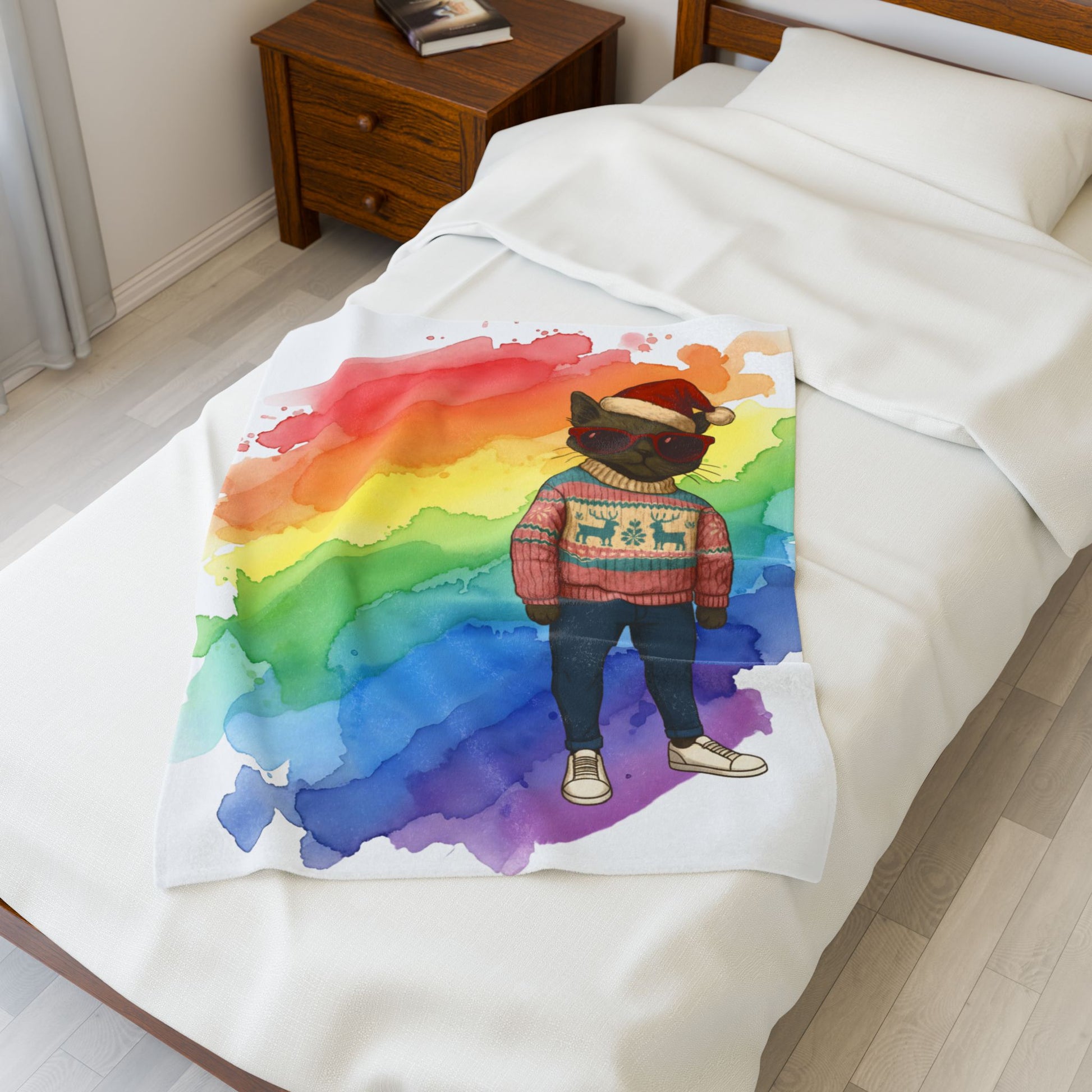 Wrap yourself in winter warmth with this cool cat. Rocking a transgender-pride winter sweater and a festive Santa hat, this cozy friend leaves space on the vibrant watercolor rainbow splash on your side of the bed. The artwork is printed in vivid, high-detail color on one side of a medium-heavy, extra-soft fabric. The plush surface drapes easily over your shoulders or across a couch, wrapping you in comfort and color. Perfect for slow winter evenings, cozy movie nights, and moments where a little pride and a lot of loving warmth make the season feel just right.