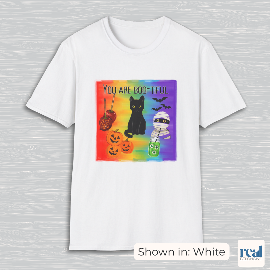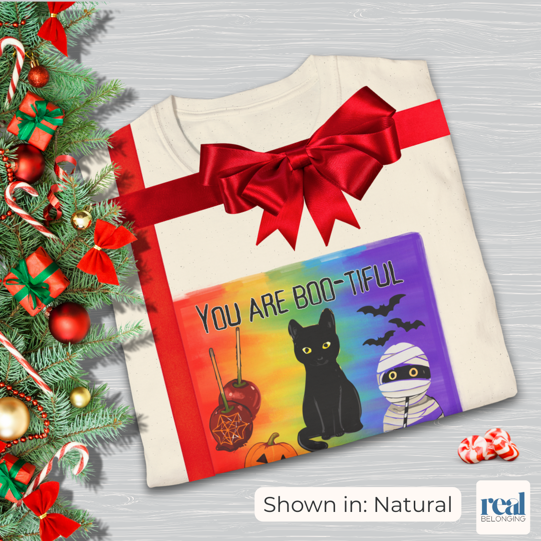 Embrace the spirit of Halloween with this fun, festive, artful affirmation. With a playful design featuring an adorable mummy, pumpkins, and a lovely black cat, this shirt adds a delightful, positive vibe to any celebration.